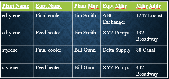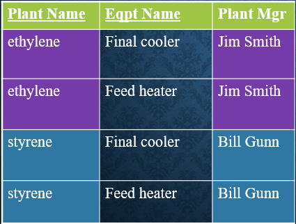 Back to our chemical plants we can see that the plant manager is dependent only on the plant name. The full primary key is both plant name and equipment name. So this is a partial key dependency.